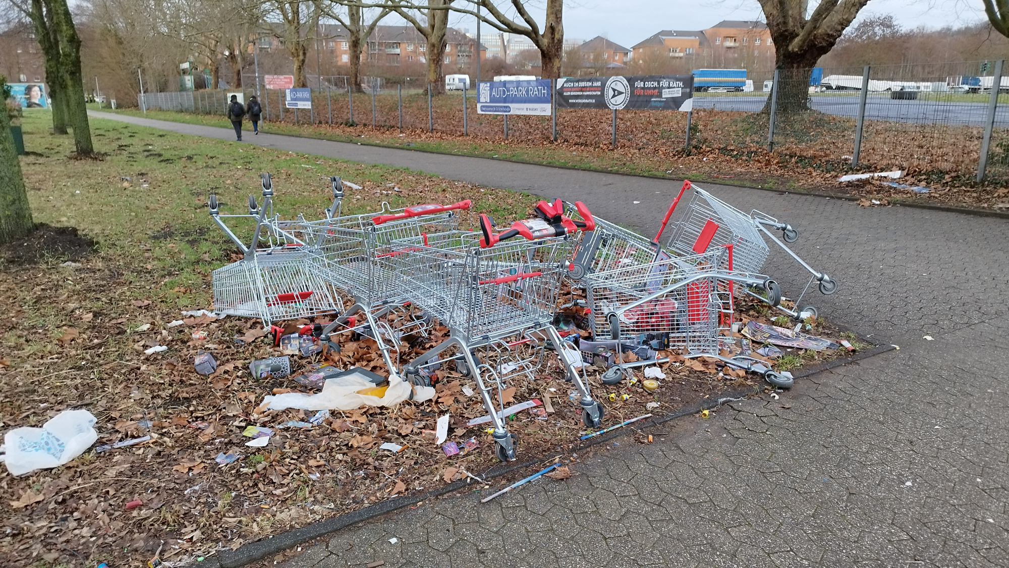 In manchen Märkten sind die Wagen mit Wegfahrsperren versehen – dann blockieren die Rollen, sobald die Grenzen des Marktes oder des Parkplatzes erreicht sind. In vielen Märkten jedoch nicht. So türmte sich kürzlich am Eingang des Schützenplatzes in Rath ein gutes Dutzend umgekippter und ineinandergeschobener Einkaufswagen. Die reinste Kunstinstallation. (Vielleicht war es eine? Eine konsumkritische?)